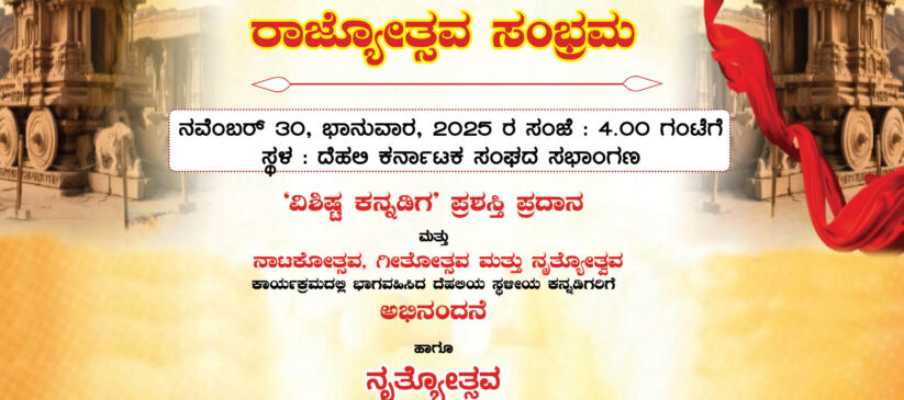 ಕರ್ನಾಟಕ ರಾಜ್ಯೋತ್ಸವ ಸಂಭ್ರಮ ನವೆಂಬರ್ ೩೦, ೨೦೨೫ | ಸಂಜೆ : ೪.೦೦ ಗಂಟೆಗೆ ಸ್ಥಳ : ದೆಹಲಿ ಕರ್ನಾಟಕ ಸಂಘದ ಸಭಾಂಗಣ ವಿಶಿಷ್ಟ ಕನ್ನಡಿಗ ಪ್ರಶಸ್ತಿ ಪ್ರಧಾನ ಮತ್ತು ನಾಟಕೋತ್ಸವ, ಗೀತೋತ್ಸವ ಮತ್ತು ನೃತ್ಯೋತ್ಸವ ಕಾರ್ಯಕ್ರಮದಲ್ಲಿ ಭಾಗವಹಿಸಿದ ದೆಹಲಿಯ ಸ್ಥಳೀಯ ಕನ್ನಡಿಗರಿಗೆ ಅಭಿನಂದನೆ ಹಾಗೂ ಸ್ಥಳೀಯ ಕಲಾವಿದರಿಂದ ನೃತ್ಯೋತ್ಸವ