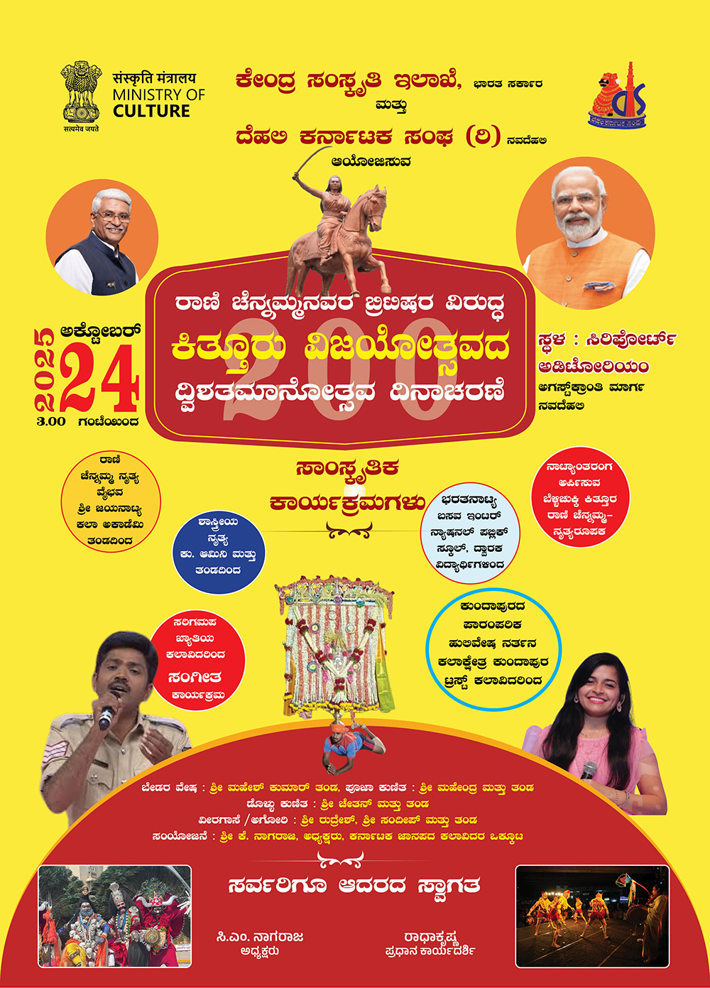 dksadmin October 22nd, 2025 ಕೇಂದ್ರ ಸಂಸ್ಕೃತಿ ಇಲಾಖೆ, ಭಾರತ ಸರ್ಕಾರ ಮತ್ತು ದೆಹಲಿ ಕರ್ನಾಟಕ ಸಂಘ (ರಿ), ನವದೆಹಲಿ ಆಯೋಜಿಸುವ ರಾಣಿ ಚೆನ್ನಮ್ಮನವರ ಬ್ರಿಟಿಷರ ವಿರುದ್ಧ ಕಿತ್ತೂರು ವಿಜಯೋತ್ಸವದ ದ್ವಿಶತಮಾನೋತ್ಸವ ದಿನಾಚರಣೆ ದಿನಾಂಕ ೨೪.೧೦.೨೦೨೫ | ಸಮಯ ಅಪರಾಹ್ನ : ೩.೦೦ ಗಂಟೆಗೆ Share This Post :